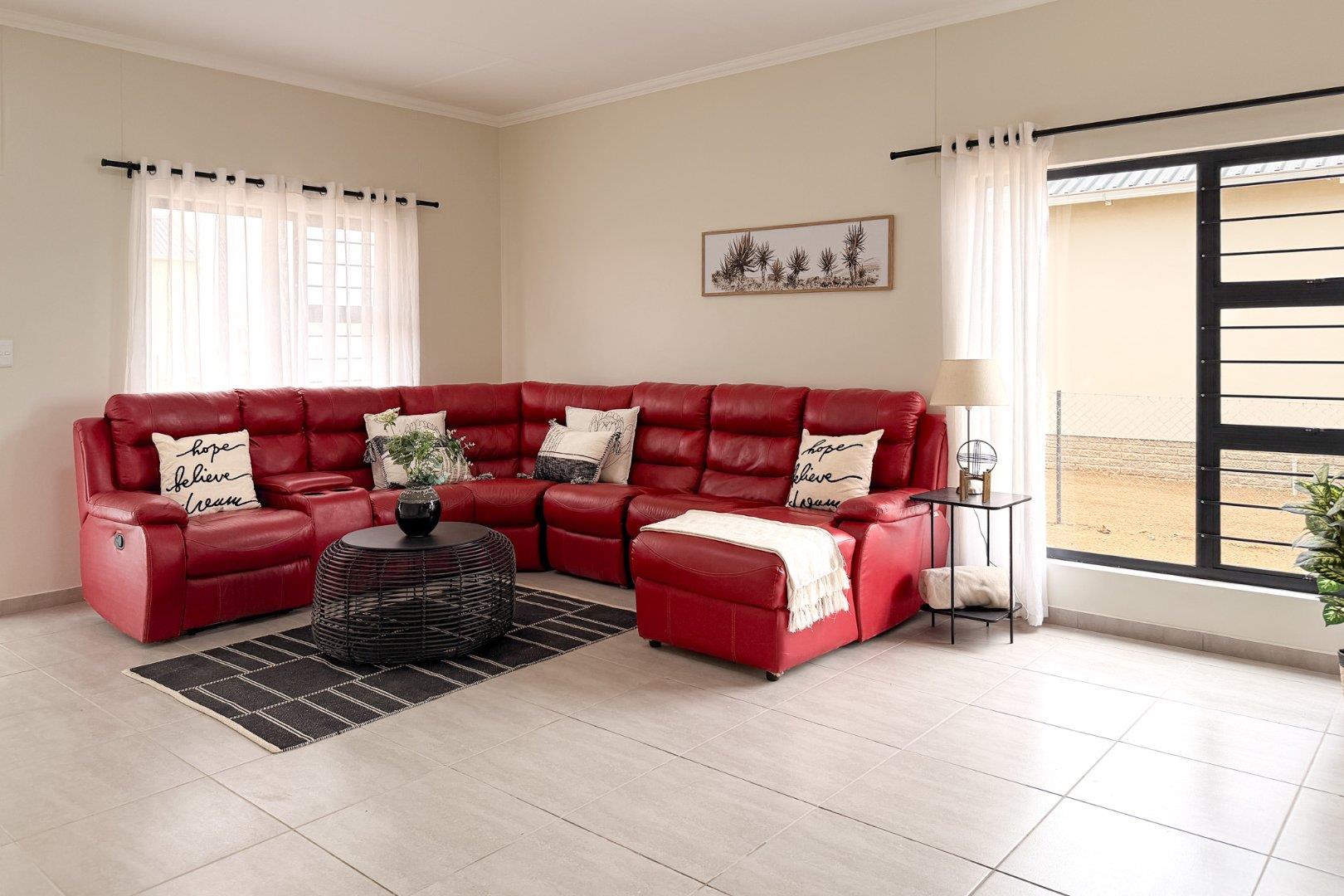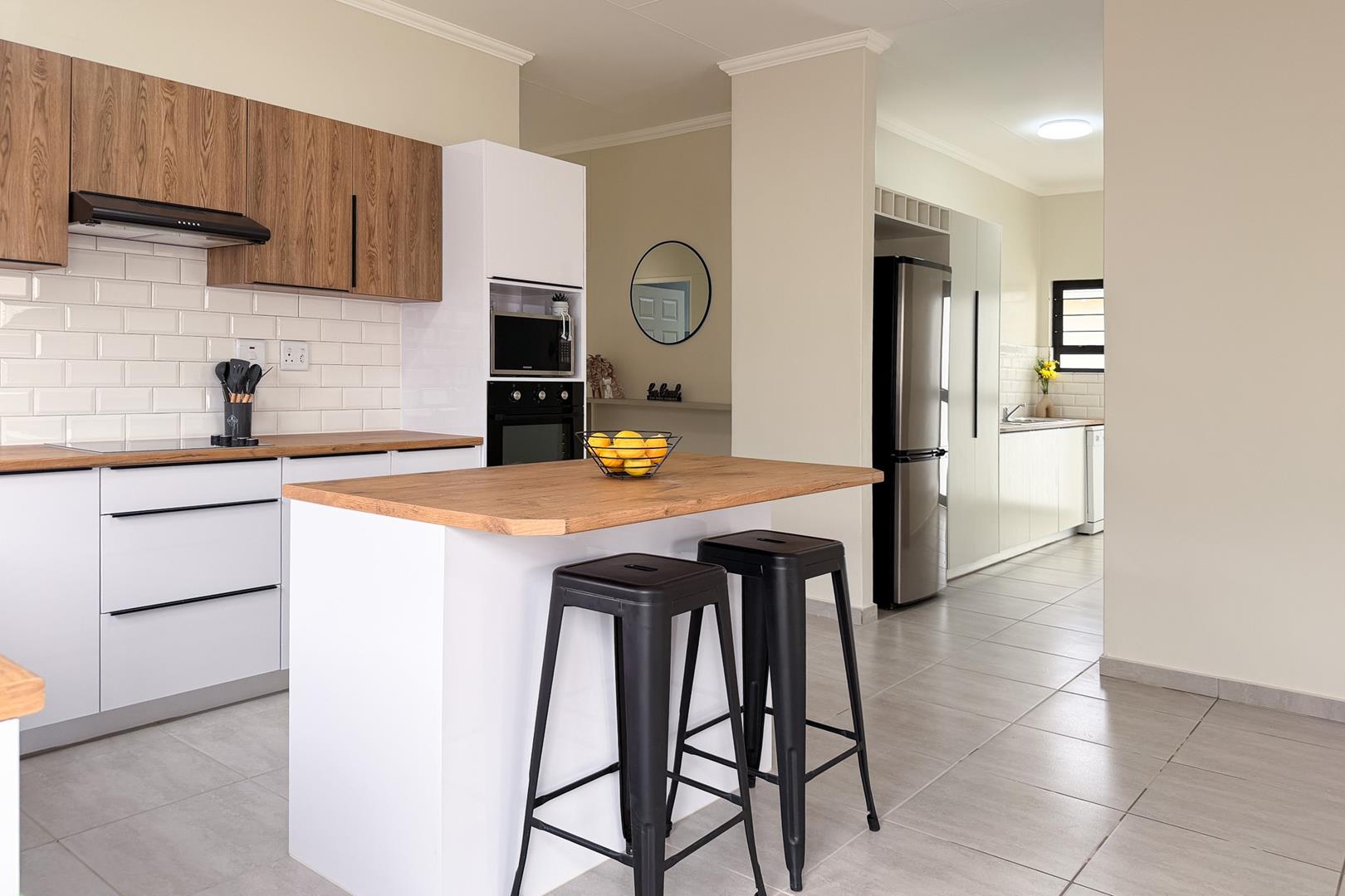 An exceptional home with open-plan living area and modern, white gloss kitchen with scullery. The 4-bedrooms offer built-in cupboards. Your spacious, main bedroom features an elegant ensuite and dressing room with extra storage. A second, full bathroom includes bath and shower. Park your vehicles in the large, double garage and enjoy the energy savings benefit of the extra-large solar geyser.