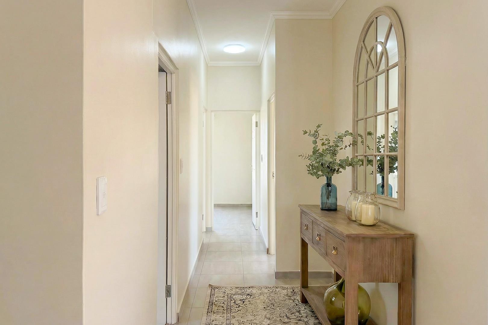 Experience the luxurious living of this extraordinary house. Three generously sized bedrooms, two full bathrooms, and modern kitchen. The open-plan living area creates a welcoming and relaxed atmosphere. Main bedroom boasts a dressing room and full ensuite. Double garage and spacious erf. Burglar bars installed to enhance security. The extra-large solar water geyser will save you electricity. THIS HOUSE IS A MUST SEE.